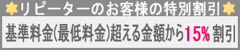 ※他の割引と一緒に利用できません。通常サービスをご利用になるお客様に限り、こちらの割引サービスをご提供しております。各サービスの基準料金(最低料金)を超えるお見積額から15%割引させていただきます。